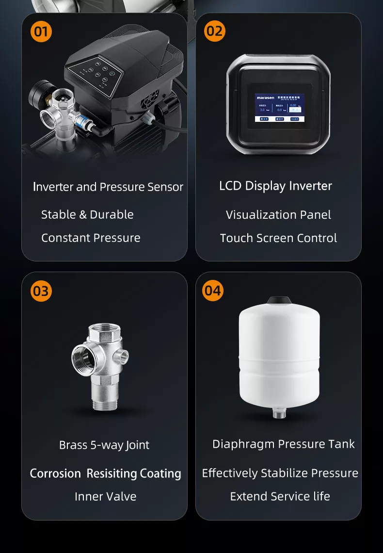 La durabilidad es clave cuando se trata de bombas de agua, y nuestra bomba de presión de varias etapas inteligente está construida para durar. Construido con materiales de alta calidad y diseñado para una confiabilidad a largo plazo, esta bomba es una inversión que le servirá bien en los años venideros. Ya sea que lo esté utilizando para aplicaciones residenciales o comerciales, puede confiar en que esta bomba resistirá la prueba del tiempo.